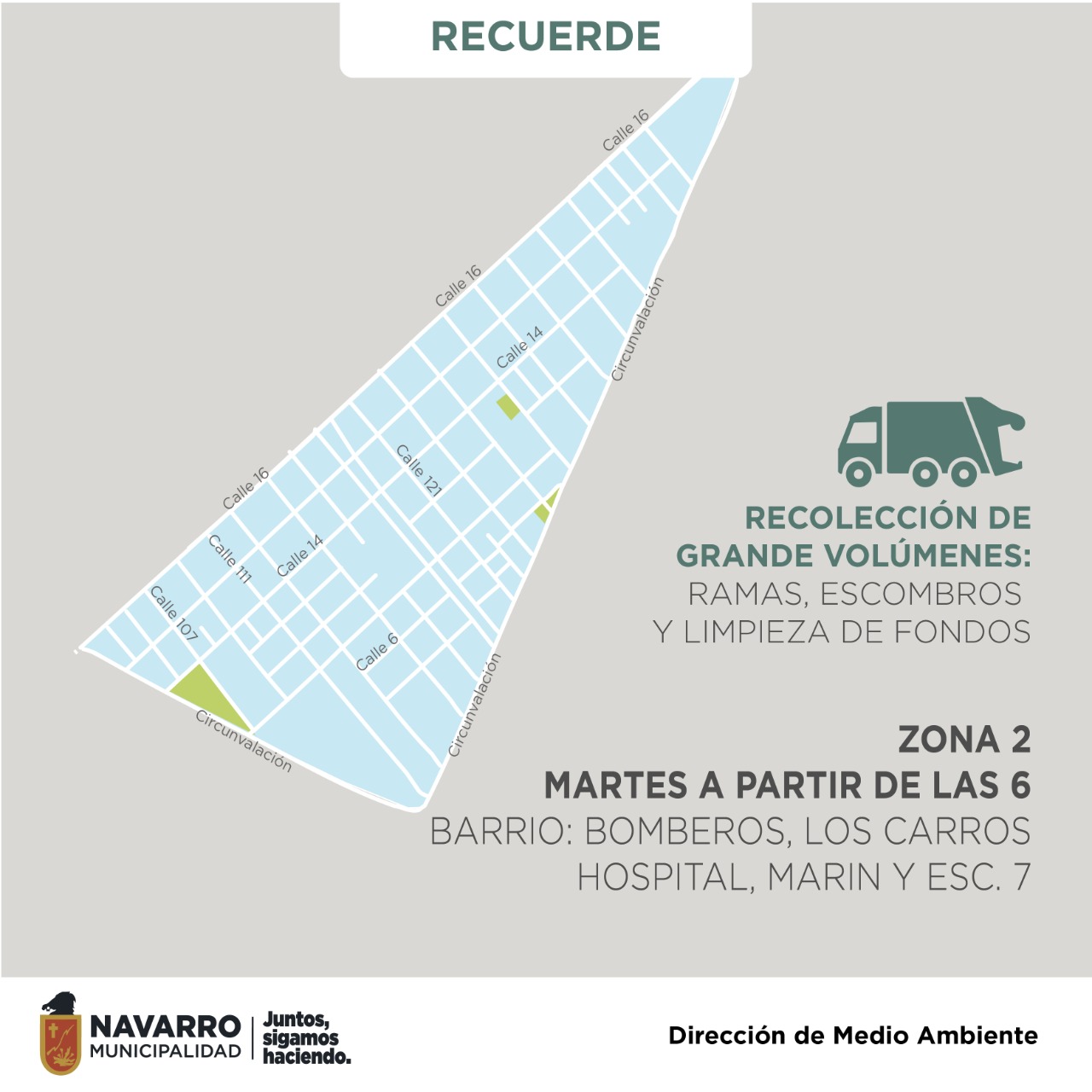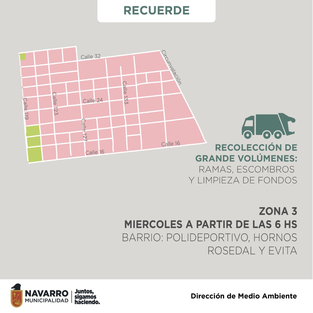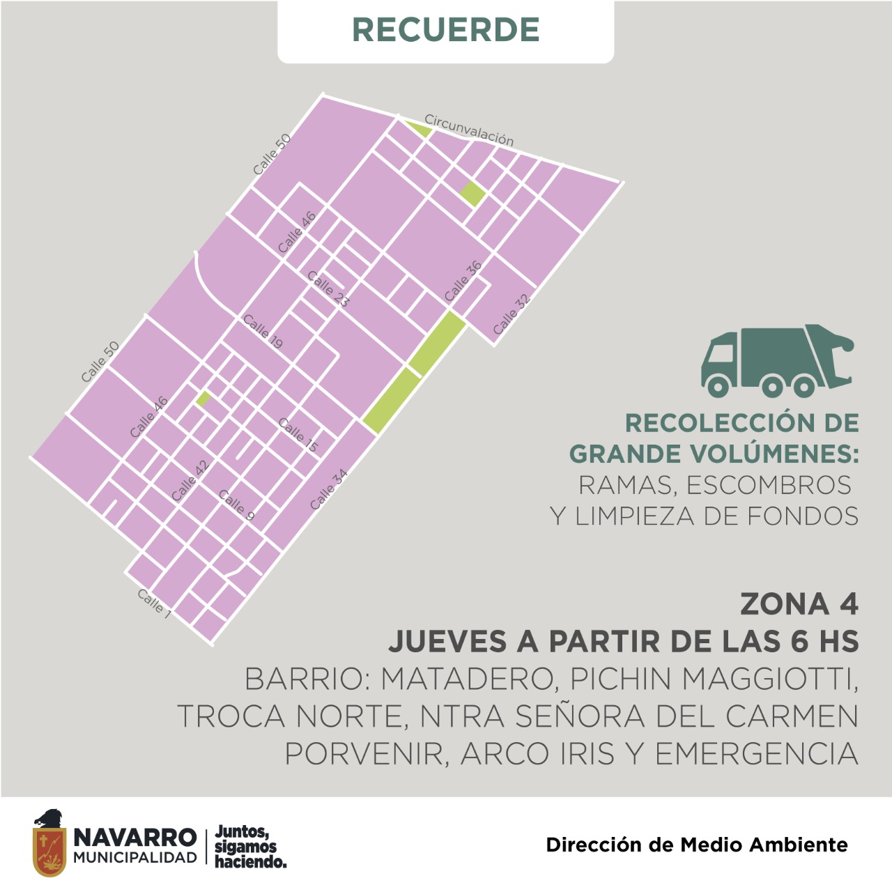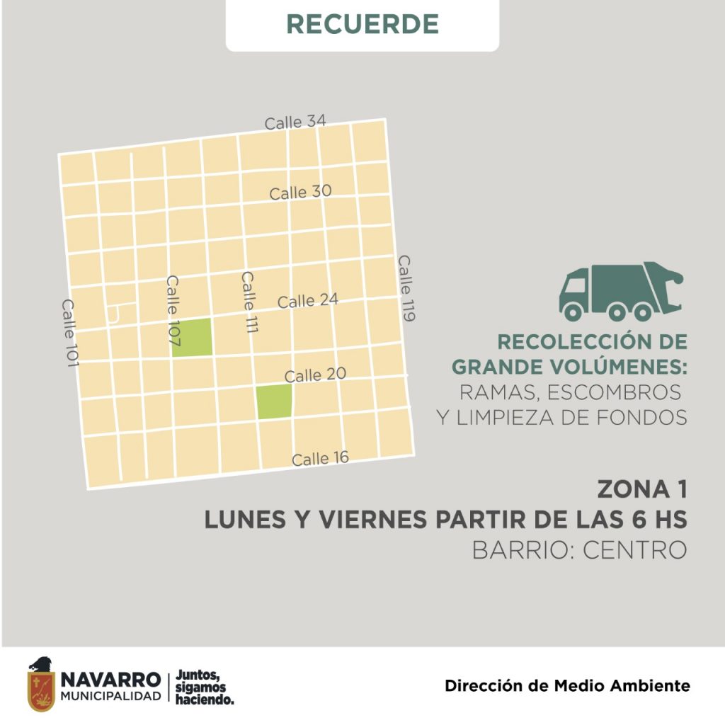 La Municipalidad de Navarro, informa por medio de la Dirección de Medio Ambiente, que a partir del lunes la recolección de Grandes Volúmenes, vuelve a la normalidad.